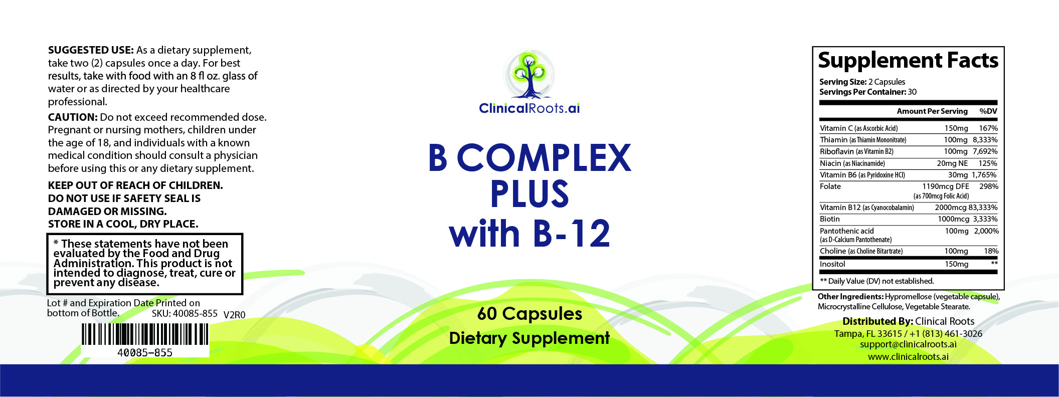 Vitamin C (as Ascorbic Acid), Thiamin (as Thiamin Mononitrate), Riboflavin (as Vitamin B2), Niacin (as Niacinamide), Vitamin B6 (as Pyridoxine HCI), Folate, Vitamin B12 (as Cyanocobalamin), Biotin, Pantothenic acid (as D-Calcium Pantothenate), Choline (as Choline Bitartrate), Inositol.