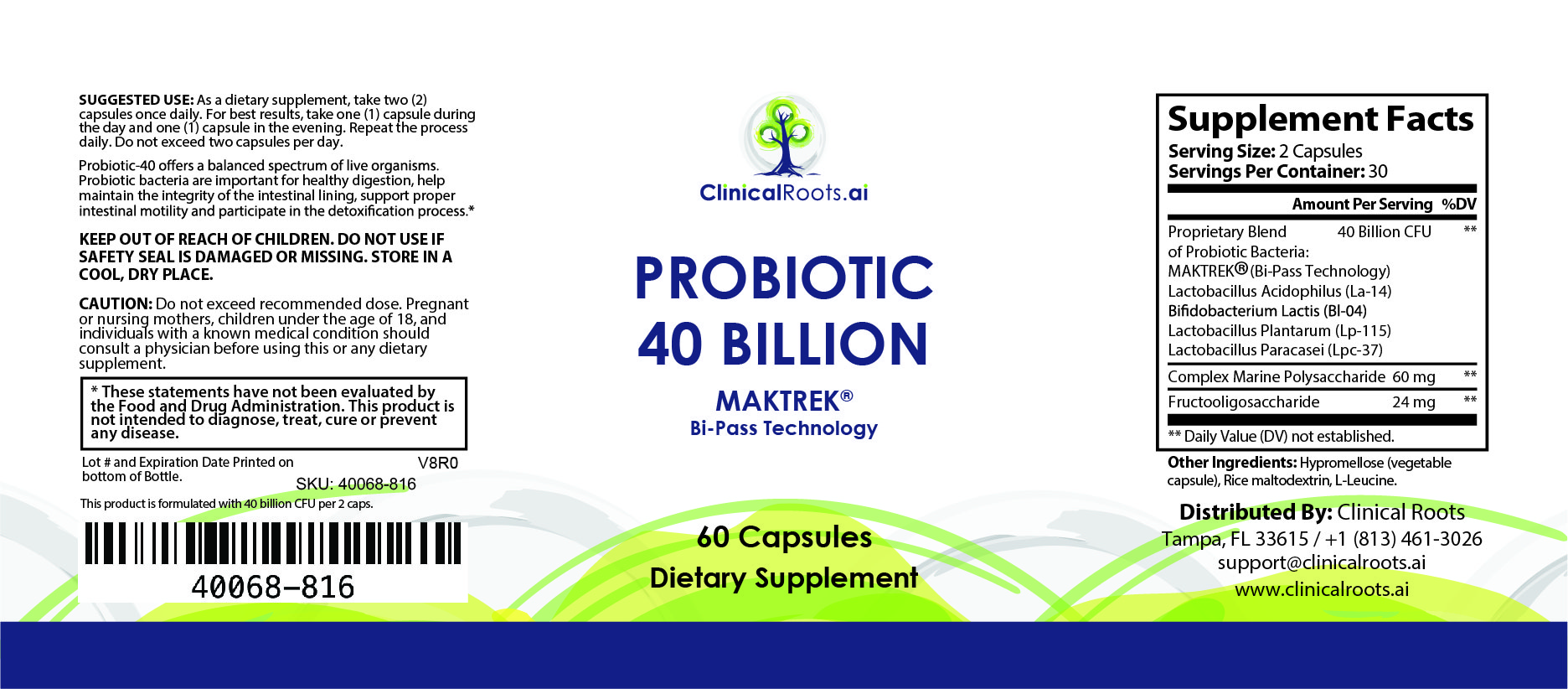 Return to ShopProbiotic 40 Billion contains 40 billion CFUs (Colony Forming Units) per capsule to possibly enhance digestive health and boost immune function. These beneficial bacteria can promote a healthy gut balance, improve nutrient absorption, and support overall vitality. Add Probiotic-40 to your daily routine to maintain a vibrant gut microbiome and potentially strengthen your immune system.