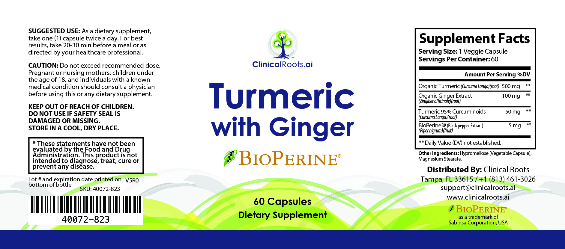 Organic Turmeric (Curcuma Longa root), Organic Ginger Extract (Zingiber officinale root), Turmeric 95% Curcuminoids (Curcuma Longa root), BioPerine® (Black Pepper Extract) (Piper nigrum fruit).